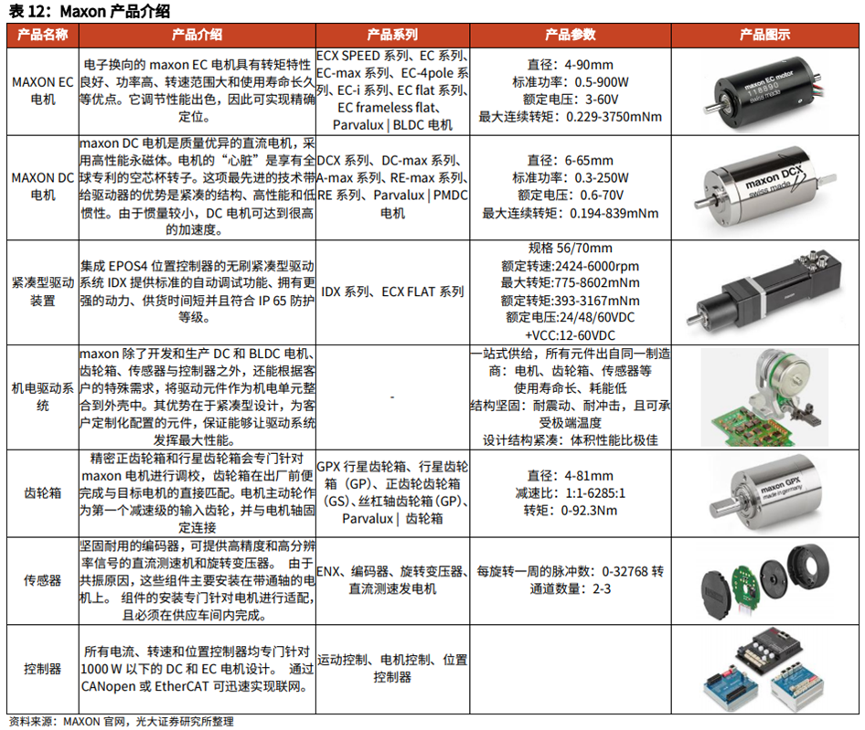 1)Maxon:拥有完善的纵向一体化电机产品矩阵。公司产品包括有刷和无刷直流电机、无刷盘式电机;行星齿轮箱、正齿轮箱、特殊齿轮箱;传感器;运动控制器、电机控制器、位置控制器;客户定制驱动方案等。 多年来为高精尖领域提供创新解决方案,具有优秀的客户背书。公司产品应用于工业自动化、医疗技术、安全技术、仪器仪表、通讯技术、日用消费等领域。美国国家航空航天局火星探测车的驱动力来源就是Maxon电机;医疗、机器人、精密工业设备等领域也有Maxon电机的应用。以上领域均为高精尖领域,Maxon具有优秀的客户背书以及较强的客户粘性。