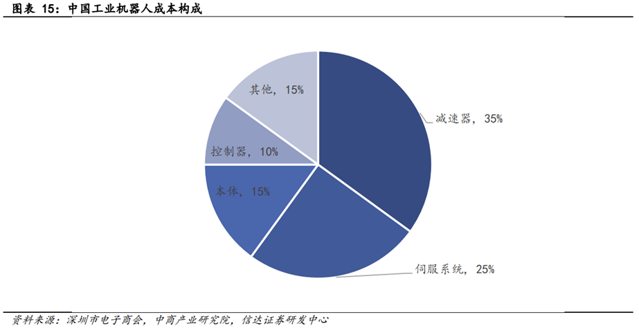 工业机器人对精度要求较高,一般使用伺服电机,伺服系统成本在机器人中的占比为25%。伺服系统作为工业机器人核心零部件,可以将控制层指令准确、及时、稳妥地传送到执行层。