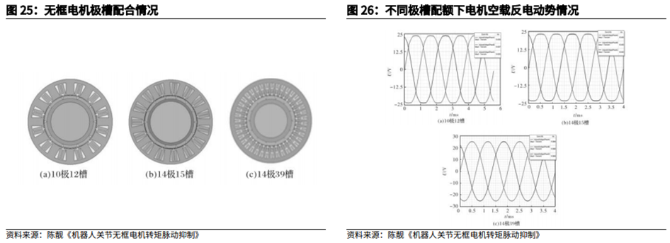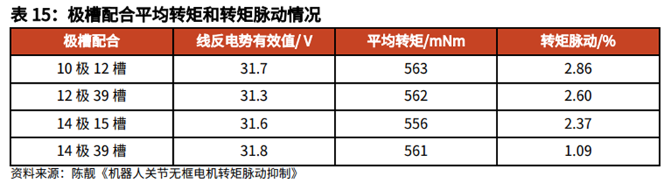 从无框电机极槽配合的角度来看,根据陈靓《机器人关节无框电机转矩脉动抑制》论文所述,通过降低电机齿槽转矩与谐波转矩,即可降低电机的转矩脉动。不同的极槽配合也会对无框电机的性能造成影响,无框电机的产品标杆科尔摩根电机大多采取用12极39槽的极槽配合方案。