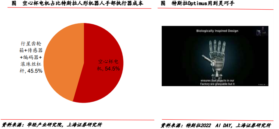 空心杯电机是机器人灵活手的关键零件。以特斯拉2023年开始生产的擎天柱Optimus的人形机器人为例,空心杯电机占单台机器人成本的4.43%,属于占比较高的零部件环节。特斯拉Optimus单手有11个自由度,采用6个执行器,采用空心杯电机+蜗轮蜗杆+金属肌腱驱动的方案,空心杯电机占手部执行器成本的54.5%。