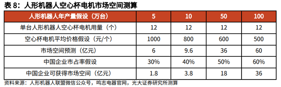 对人形机器人空心杯电机市场空间进行了简单测算,核心假设如下: