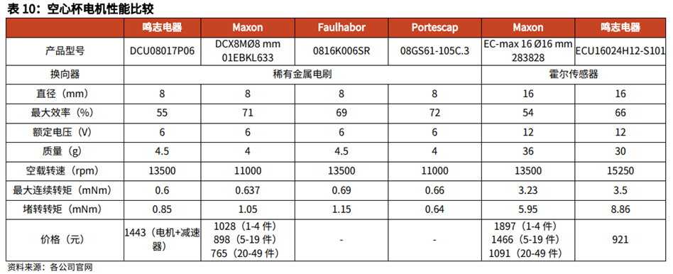 我们另以8mm有刷空心杯电机、16mm无刷空心杯电机相似口径,将国内外空心杯电机产品性能作比较。需要指出的是,无刷小尺寸直径空心杯电机国内尚无可比产品。对于8mm直径有刷空心杯电机:海外公司的产品效率更优,最大连续转矩也更优,而在转速方面差异不大,价格方面国内产品则更低;对于16mm无刷空心杯电机,国内产品效率、转速、连续最大转矩更优,价格也更便宜,说明国内产品的部分产品策略、产品性能是较为成功的。