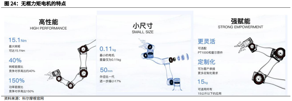 协作机器人具有紧凑小型化、轻量化特性,因此选择更加紧凑、高效率的电机方案。协作机器人与传统工业机器人在构造上有一定差异, 协作机器人通常采用整体式的无框电机,采用关节一体化技术。能够认为随着未来机器人小型化的发展,协作机器人关节中狭窄的安装空间和末端力矩的要求显著增高,对无框电机本身性能的挑战也不断提升。