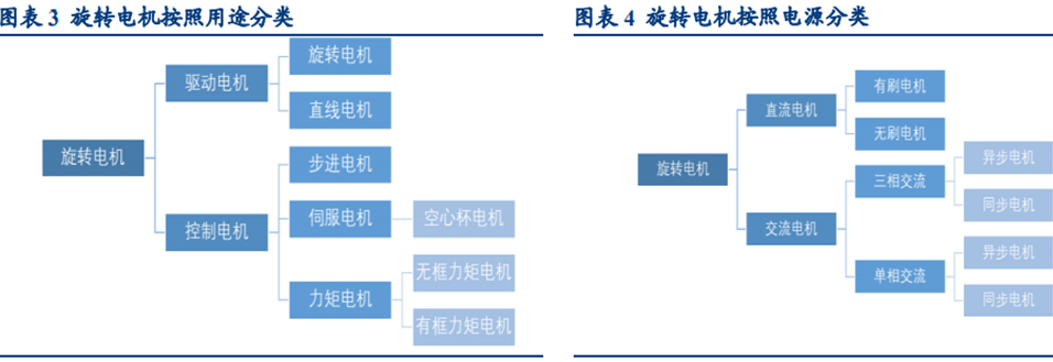按照用途:可分为驱动电机和控制电机。控制电机又可分为步进电机、伺服电机以及力矩电机。随着现代科学技术的发展,电机在实际应用中的重点已经从过去简单的传动向复杂的控制转移,特别是对电机速度、位置、转矩的精密控制。