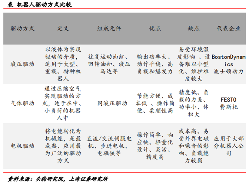 驱动系统是使机器人发出动作的机构,是机器人的关键部件,按照动力来源可分为液压驱动、气体驱动和电机驱动三种方式,其中电机驱动是应用最广泛的方式,具有高精度、实时响应等优势,更适合如今机器人发展趋势。美国波士顿动力公司在其Atlas机器人中使用液压驱动方式因其驱动强劲、爆发力强适用于弹跳、负重等活动,适用于注重运动能力的Atlas机器人。其余的大部分机器人公司采用电机驱动,如特斯拉人形机器人Optimus更注重智能化,采用高扭矩密度电机伺服技术。电机驱动在动作的精准控制方面与其他驱动方式相比更胜一筹,配合处理器编码器可获得实时运动状态反馈,更适合如今注重智能化、多功能的机器人发展趋势。
