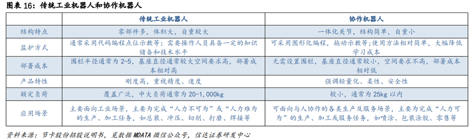 协作机器人追求轻量化、人机相互。协作机器人是在SCARA机器人以及垂直多关节机器人等机械结构基础上衍生出的新类型。协作机器人除在外观形态上与传统工业机器人有些差别外,在产品特性上也区别于传统工业机器人追求的“刚度”,协作机器人更多追求轻量化、柔性和安全协作性。此外在结构特点、交互方式、部署成本以及应用场景等方面与传统工业机器人也存在一定的差距。