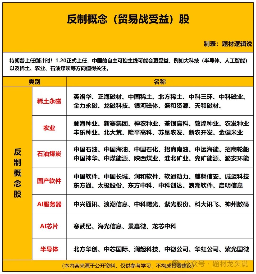 随着特朗普的上任,特朗普的贸易保护政策可能会对中国制造企业的出口和盈利造成影响,尤其是对美国出口比例较大的企业。这可能会对A股市场中的出口型企业造成压力。中国的自主可控主线可能会更受益,例如大科技(半导体、人工智能)以及稀土等方向。