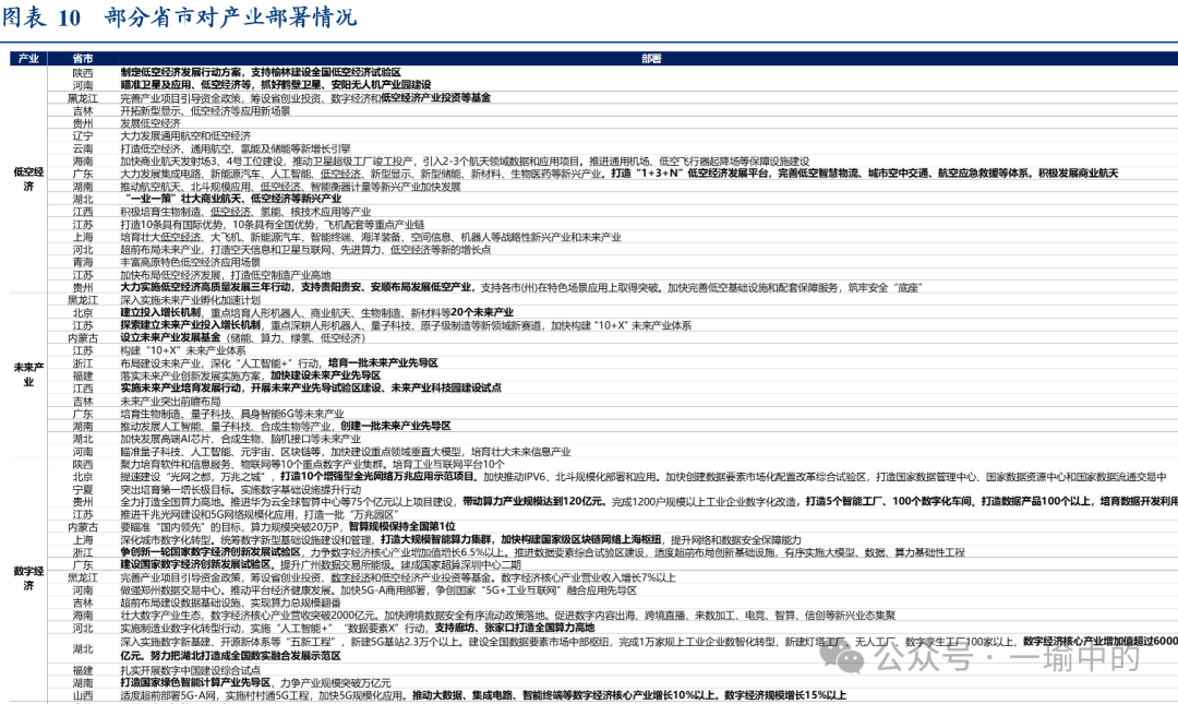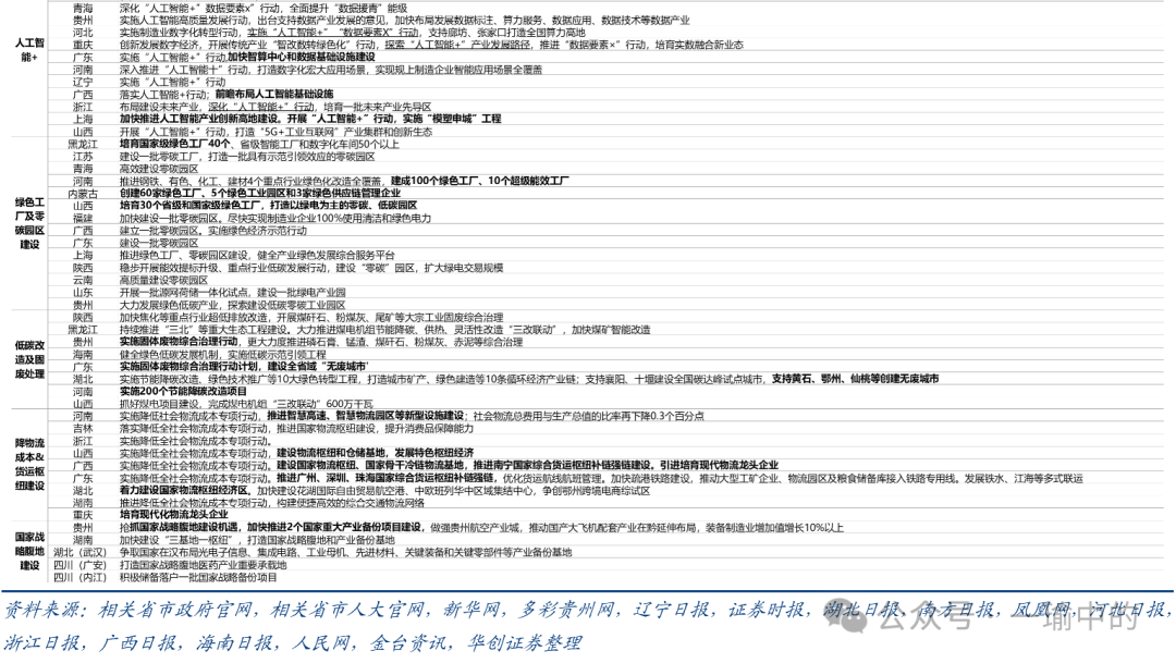 今年地方的产业“共识”包括:低空经济、数字经济、未来产业、“人工智能+”、绿色工厂及零碳园区建设、低碳改造及固废处理、降物流成本&货运枢纽建设等。今年地方产业的“特殊”是指:贵州、四川、湖南、湖北(武汉)少数中西部省市,强调抓住国家战略腹地和产业备份建设机遇,并就具体产业做出部署,如贵州“加快推进2个国家重大产业备份项目建设,做强贵州航空产业城,推动国产大飞机配套产业在黔延伸布局”。