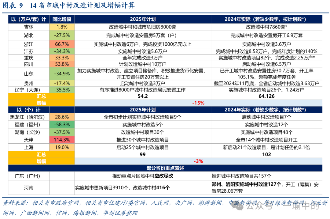 14省市情况看,目前城中村目标的增量可能有限。以万户/套计,浙江、湖北、江苏、四川、山东等9省合计,增幅约-15%。以城中村改造的个数计,上海、天津等5省市,城中村计划改造个数增幅为-3%。需要注意的是,当前公布省市有限,因此统计结果可能并不能代表全国整体情况。