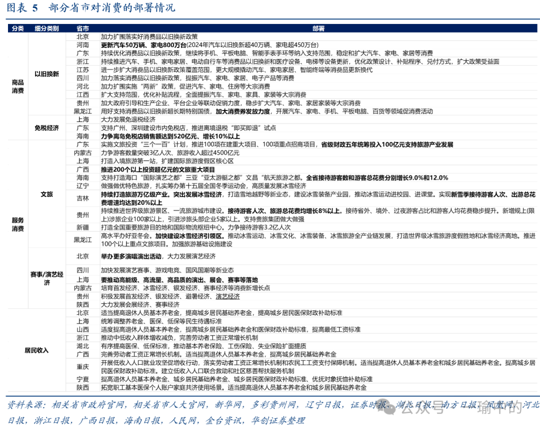 从抓手来看,大宗(加力扩围实施消费品以旧换新)、文旅仍是今年地方促消费主要抓手。除此外,今年地方的新提法主要有两方面:一是落实去年中央经济工作会议,部署落实重点群体增收减负工作,多省提到提高退休人员基本养老金、城乡居民基础养老金、城乡居民医保财政补助标准。二是广东、北京、上海等地新提到演艺经济、赛事经济、免税经济等新增长点。