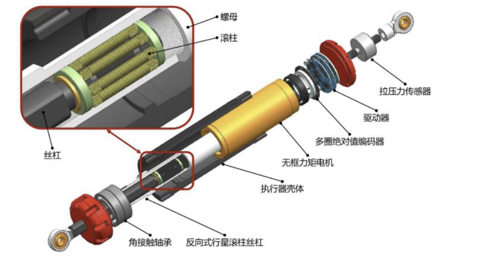 线性执行器将电机输出的旋转运动转化为“伸缩”式直线运动,主要结构包括电机(无框力矩电机)、传动部件(行星滚柱丝杠、轴承)、传感器(力/力矩传感器、编码器)。