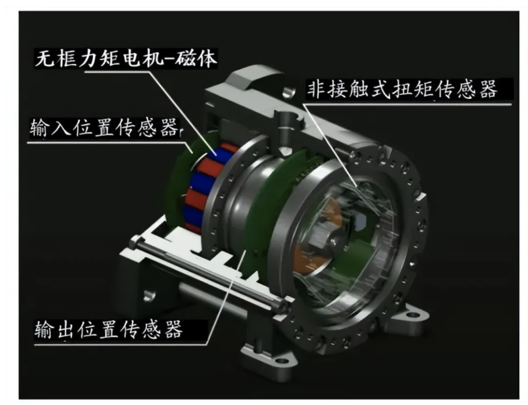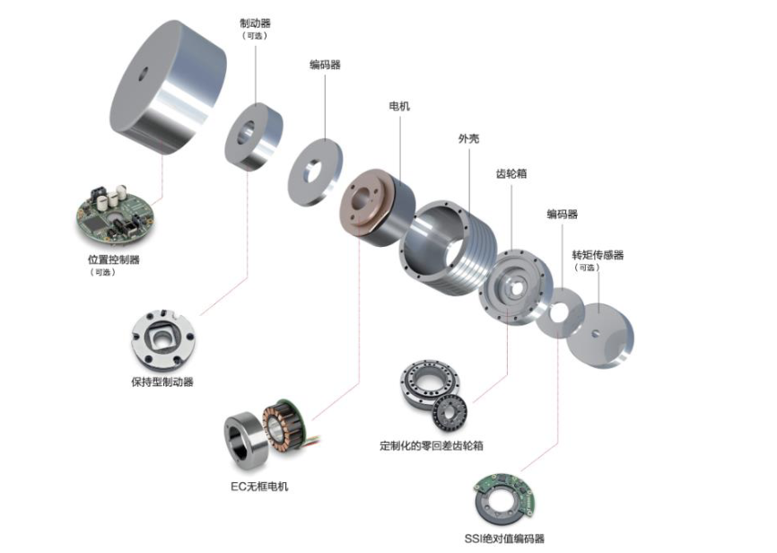 无框力矩电机提供动力,谐波减速器用于降低转速、增大扭矩,力矩传感器和编码器用于监测运动状态,驱动器则负责控制电机的运行。
