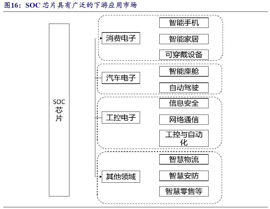 SOC芯片的下游应用几乎涉及国民经济各大领域,包括智能手机、平板电脑、智能家电、智能家居等消费电子级领域,网络通信、信息安全、工业控制与自动化等工业电子领域,汽车电子领域以及人工智能等新兴应用领域。