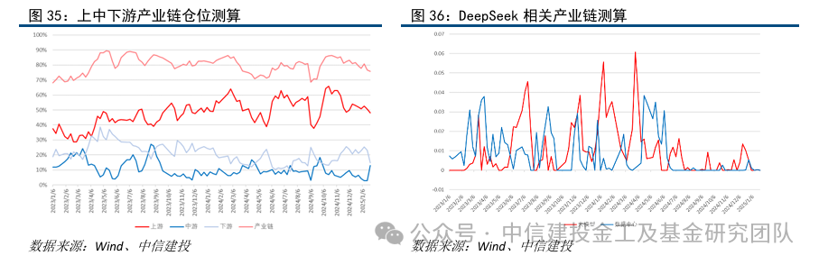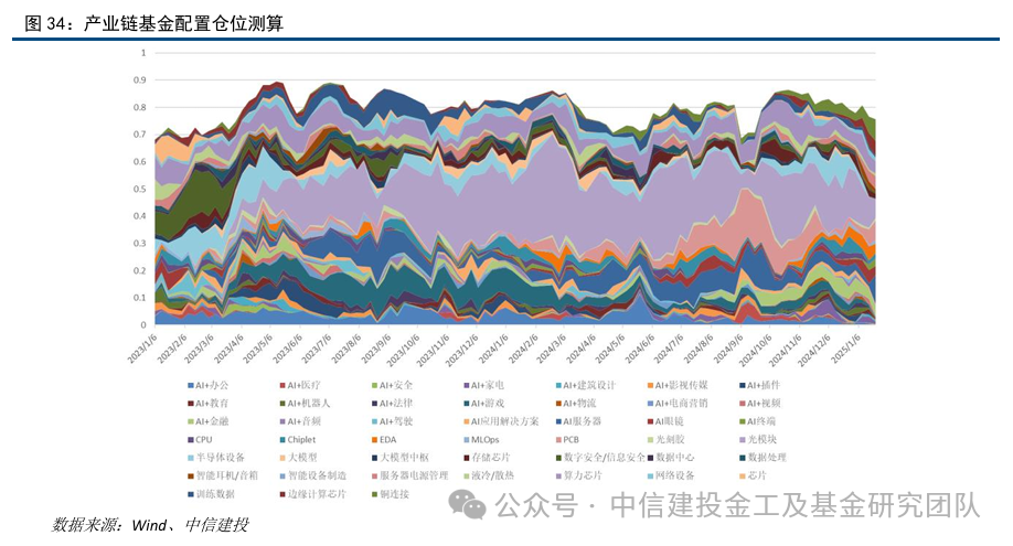 基于最新的仓位测算,主动管理基金在人工智能产业链总仓位较2024年11月高点下降约10%,减仓上游光模块、半导体设备明显,增配AI服务器、边缘计算芯片及铜连接。DeepSeek概念个股持仓在细分类别里主要分布在中游大模型和数据中心领域,主动权益数据中心相关仓位目前处于较低水平,未来仍有较大增配空间。