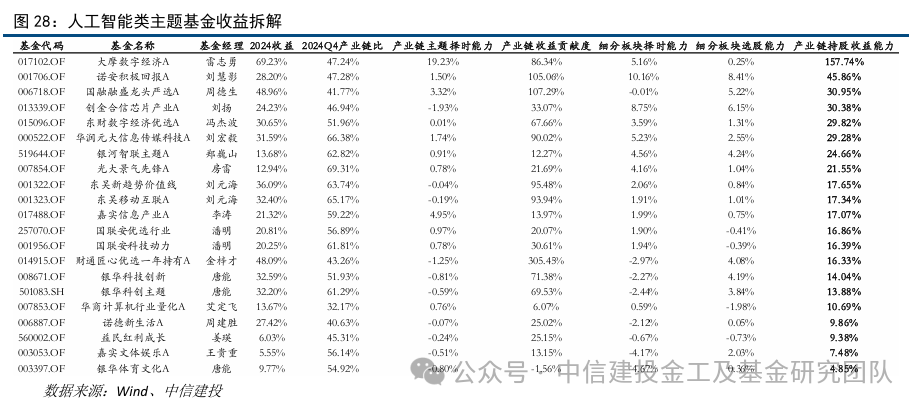 统计2024年期间类人工智能产业主题基金的持股收益,计算该基金在人工智能产业链的持股的收益贡献度,并测算基金在细分板块的配置收益及选股收益。假设基金在中报和年报披露的持仓表示基金下半年的持仓保持不变,期间不调仓。