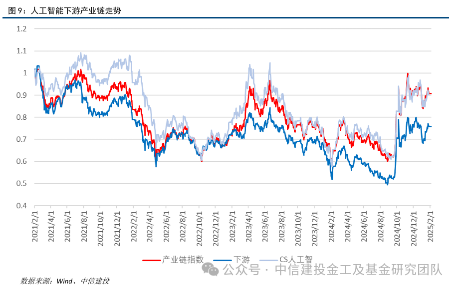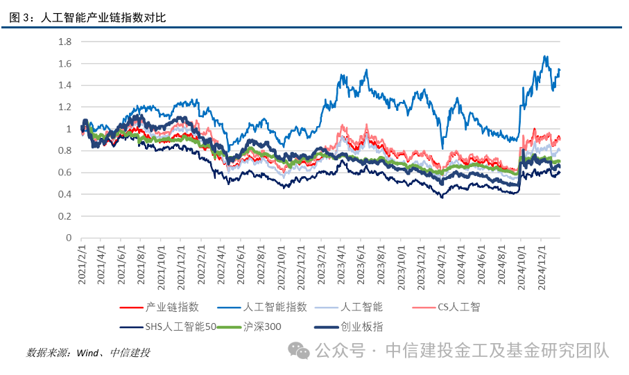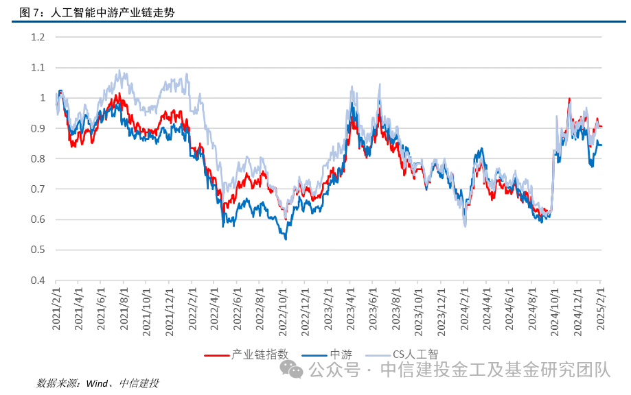 我们将和人工智能产业链相关的个股进行汇总,构建人工智能产业链股票池,总计400只个股纳入统计,主要来自电子、通信、计算机、传媒和机械等行业。为了方便横向对比分析各产业链环节的表现,我们将股票池的个股以市值加权的方式编制产业链指数,指数成份来自于人工智能产业链股票池中的股票。统计指数在2021年2月1日至2025年1月底的收益表现,人工智能产业链股票池指数累计收益为-9.39%,最大回撤为43.19%,年化波动率为28.51%。