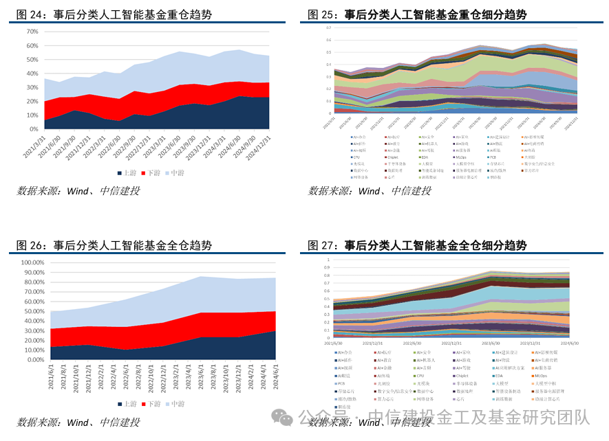 针对投资人工智能产业链市值中枢不低于70%的类主题及被动指数基金,统计其在人工智能产业链上的具体投资偏好。从2021年至2024年中报的数据来看,人工智能产业链基金逐渐提升在人工智能产业链的覆盖度,在产业链顺位上,提升上游和中游的配置,降低下游的配置;细分类别中,长期在大模型领域配置比例较高,2023年后迅速提升了在光模块的投资比例,这个结果在重仓和全仓的观察情境下都是类似的。