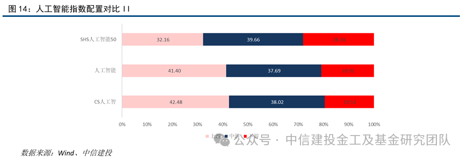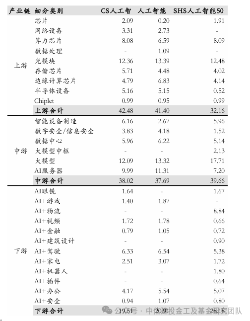 CS人工智和人工智能指数的成分股均以上游为主,而SHS人工智能50指数在中游和下游的占比最高,最新的一期占比接近39.66%和28.18%,CS人工智指数在中游产业占比相对较低(37.59%),人工智能指数的成分股中游产业占比37.69%。从细分板块来看,人工智能指数的AI服务器、大模型和光模块的占比较大,其中光模块成分股的占比达13.39%。CS人工智指数中的光模块和大模型占比相对较高,两者占比分别为12.36%和12.09%。SHS人工智能50在下游多个AI应用端标的均有覆盖。