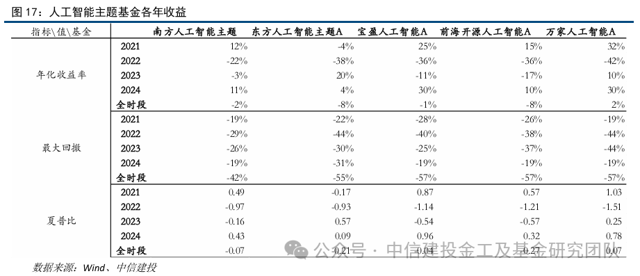 统计2021年1月 1日至2024年底这个区间的业绩表现,万家人工智能年化收益相对较高,2024年基金实现超过约30%的业绩增长,基金经理耿嘉洲2020年5月开始管理本基金,但基金在2022表现较差;宝盈人工智能同样2024年基金实现超过约30%的业绩增长,基金经理张天闻2023年4月开始管理本基金,但基金在2022及2023年表现较差;东方人工智能主题严凯2020年开始管理本基金,基金2023年在逆市中实现正收益;南方人工智能主题罗安安为三位基金经理中最早管理,2018年开始管理本基金,2024年全年收益超过10%。