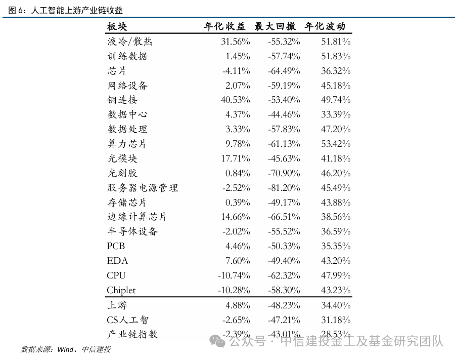 我们梳理的人工智能产业链的上游产业链中共117只相关个股,包括了海天瑞声、紫光国微和新易盛等个股,一级行业主要来自电子和计算机。在上游产业链中进一步细分资源类型,将股票划分为芯片、光模块和数据处理等细分类别,其中芯片部分个股较多。上游产业链指数2021年2月1日至今的收益率为20.26%,其中铜连接细分板块指数均显著跑赢整体上游产业链,累计收益高达273.35%。