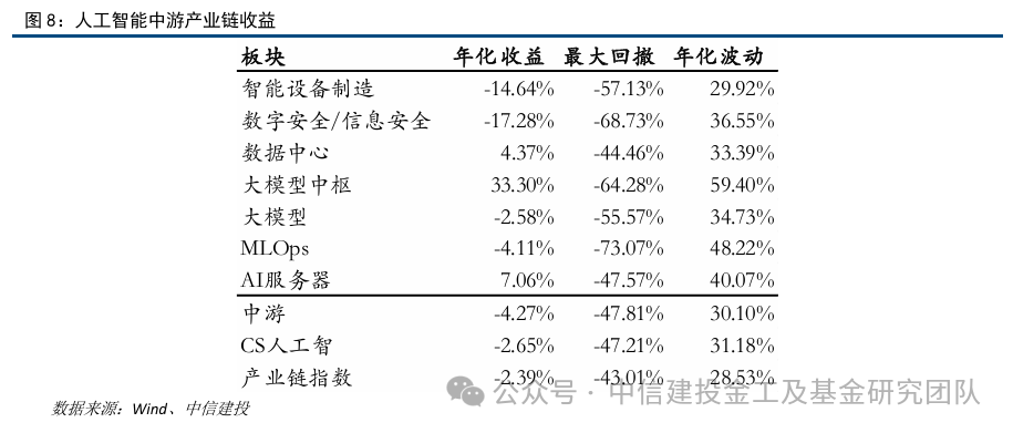 经统计,中游产业链指数2021年2月1日至今的收益率为-15.55%,其中大模型中枢板块表现较好,区间收益率高达204.32%。