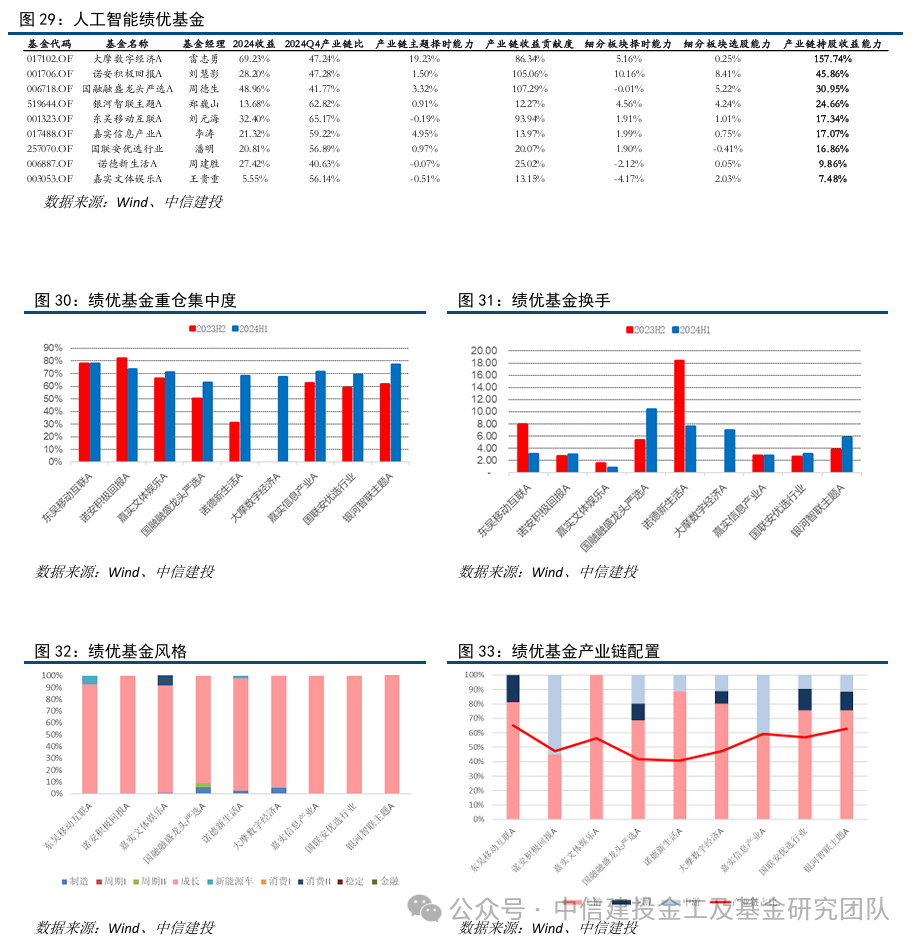 基于前述的分析,我们筛选了在人工智能产业链仓位中枢高于70%、基金规模高于5亿、产业链持股收益能力排名靠前的基金产品,相同基金经理的产品仅保留1只代表产品。最终我们筛选了9只人工智能仓位中枢较高、基金持股收益能力突出的类人工智能主题基金,分别为东吴移动互联、诺安积极回报、嘉实文体娱乐A、国融融盛龙头严选、诺德新生活、大摩数字经济、嘉实信息产业、国联安优选行业、银河智联主题,其中大摩数字经济的人工智能产业链持股收益能力名列前茅。同时大摩数字经济A表现出了较强的产业链主题择时能力。从持股集中度来看,这几只基金均属于集中持股的操作风格,其中诺德新生活的持股集中度较高。另外,嘉实文体娱乐的换手率低,而诺德新生活换手率较高,但2024年H1大幅度减少换手。在行业板块配置方面,产业链个股主要属于成长板块,这些基金在板块配置方面偏好相似。