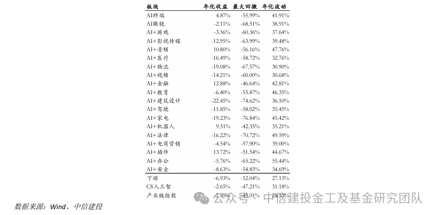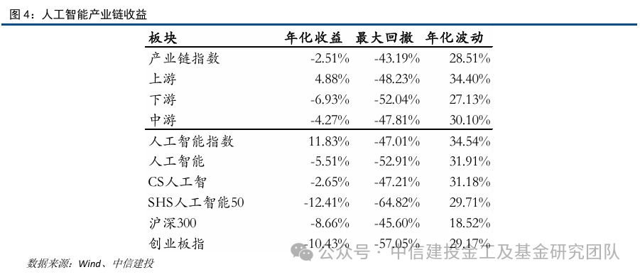 同期人工智能指数(884201.WI)、人工智能(931071.CSI)、CS人工智(930713.CSI)、SHS人工智能50(931487.CSI)、创业板指数和沪深300指数的累计收益率分别为54.09%、-19.7%、-9.88%、-39.91%、-34.69%和-29.54%。在人工智能产业链股票池中,上游产业链、中游产业链和下游产业链的区间收益分别为20.26%、-15.55%和-24.27%,其中上游产业链的累计收益和收益风险比均表现最佳。