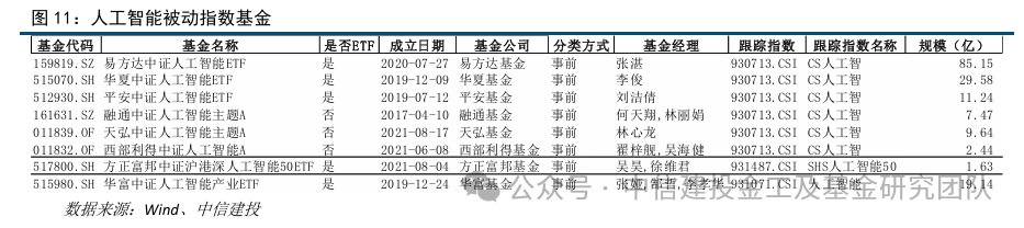 被动指数基金共8只,总规模166.29亿,跟踪指数包括CS人工智(930713.CSI)、中证人工智能产业(931071.CSI)及SHS人工智能50(931487.CSI)。CS人工智指数以上游配置为主(光模块占比12.36%),SHS人工智能50中下游占比最高(39.66%)。主动管理基金共5只,总规模102.82亿。