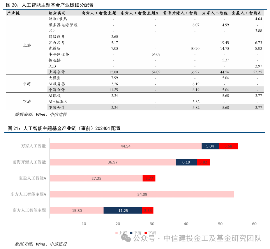 五只基金对人工智能产业链均保持较高覆盖,其中南方人工智能主题2023年以来显著提升产业链配置中枢。为了体现时效性,我们此处放上2024年四季报五只基金的产业链配置情况,可以看到东方人工智能主题在半导体设备的配置权重较高,南方人工智能主题上游配置光模块、算力芯片以及网络设备,中游配置大模型和AI服务器,下游配置AI眼镜;宝盈人工智能上游配置较为全面,增加了液冷散热的配置,在中游没有配置,但在下游同样配置了AI眼镜;万家人工智能上游配置光模块和算力芯片,同时配置服务器电源管理以及铜连接,中游配置大模型,下游配置AI眼镜;前海开源人工智能上游主要配置光模块,下游配置AI+机器人。