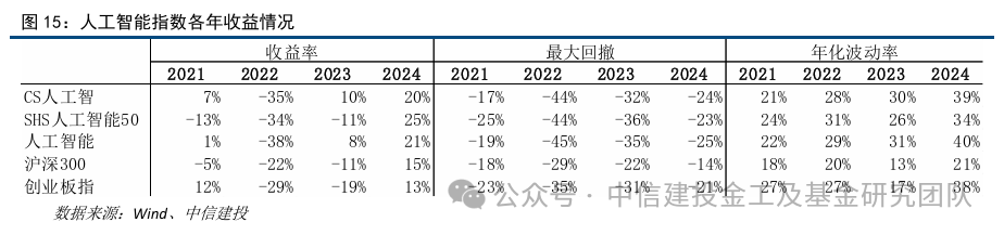 人工智能各类指数过去几年里经历了一些起伏,但总体上显示出了复苏的迹象。尽管在2022年这些指数都遭受了较大的损失,但在随后的年份里,收益率开始回升。特别是CS人工智和人工智能指数,在2023年维持正收益并且在2024年的全年收益率都达到了20%以上,相对沪深300及创业板指在2023年有接近20%的超额,在2024年的超额接近5%,而SHS人工智能50在2024年反弹最强。