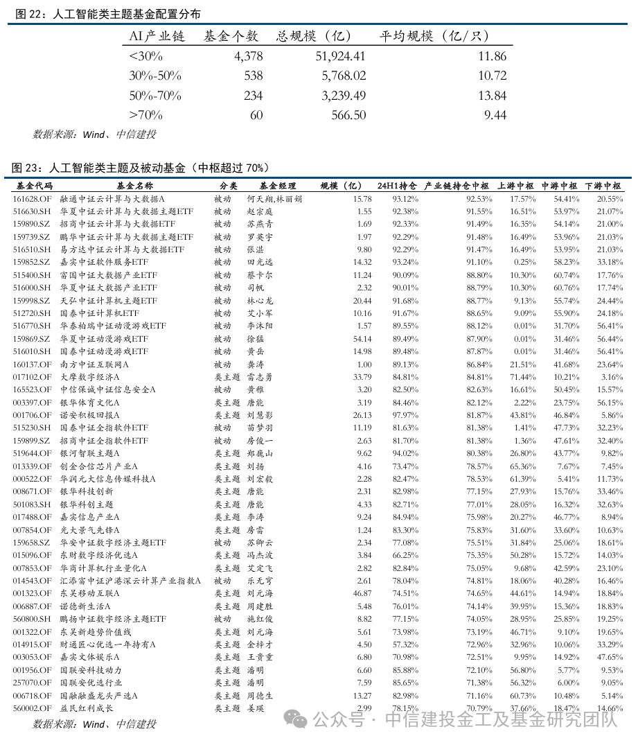 本章筛选成立超过1年的主动权益基金及被动指数基金,根据近4期中报和年报披露的全部持股计算基金持有人工智能产业链个股市值占股票市值的平均比例。经统计,投资人工智能产业链个股市值占股票总投资市值比例超过70%的基金共60只,最新规模不低于1亿的共41只,投资比例超过50%的基金共294只。