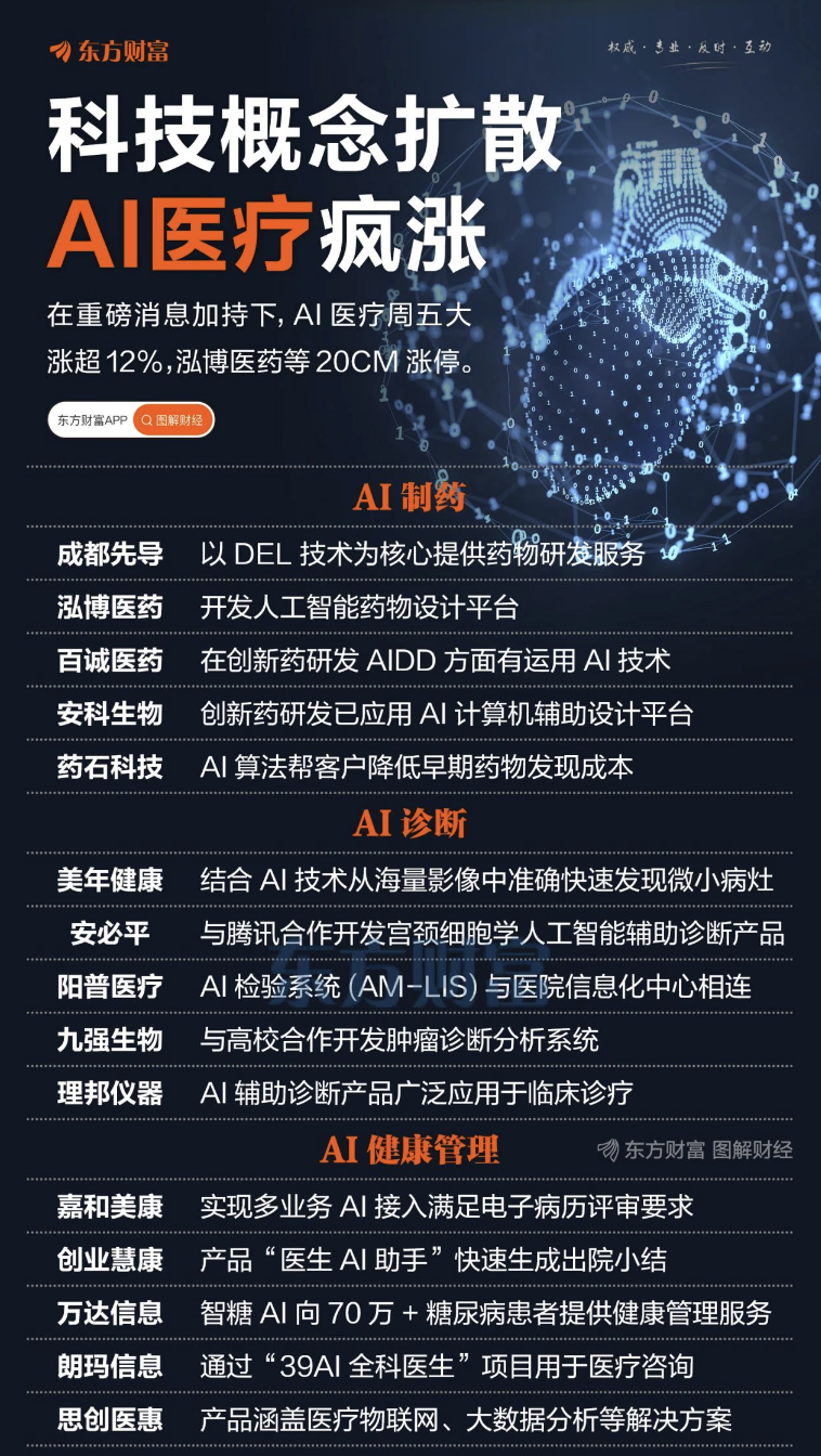 AI医疗概念还在持续,后面依然是AI应用主线需要重视的分支。国金证券指出,医药AI投资建议围绕三大领域:(1)医疗设备与诊断影像、(2)药物设计和研发、(3)互联网医疗与大健康展开医疗人工智能投资布局。