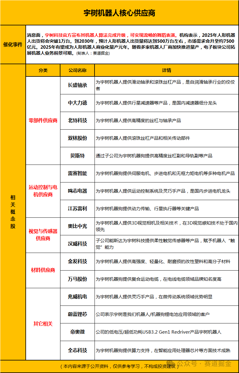 - 相关标的梳理:长盛轴承(自润滑轴承)、瑞芯微(端侧算力)、卧龙电驱(参股)、凌云光(动捕设备)、道通科技(解决方案合作)、速腾聚创(激光雷达)等。