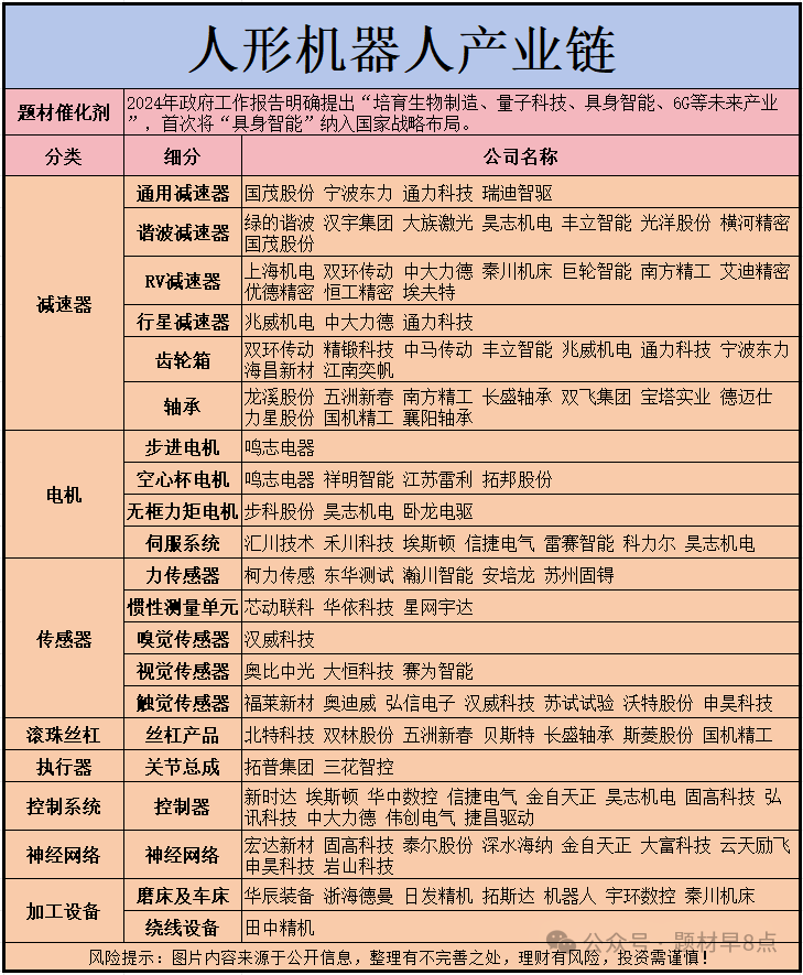 3.丝杠端:五洲新春/北特科技/绿的谐波/震裕科技/贝斯特/双林股份/南京化纤/恒立液压/斯菱股份/新坐标/雷迪克/兆丰股份等;