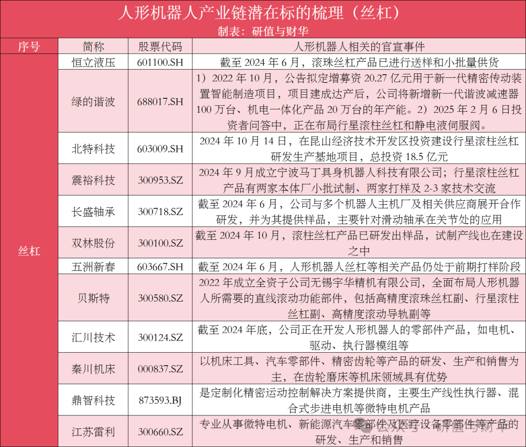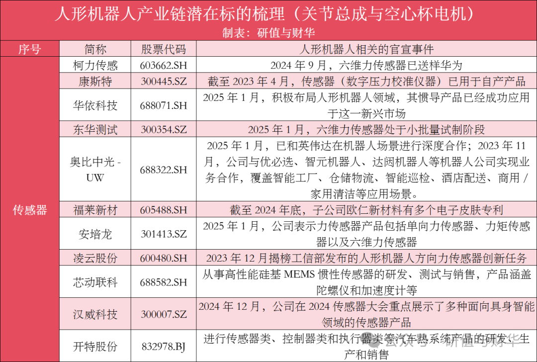 人形机器人自由度超过60个,国内零部件企业迅速发展:根据特斯拉数据,我们预计Optimus Gen 3本体和四肢的自由度28个,灵巧手自由度或达34个,合计自由度超60个。主要零部件包括无框/空心杯电机、谐波减速器、滚柱丝杠、一维力/六维力/位置传感器、轴承等。(本文首发公众号:研值与财华)我们梳理了国内人形机器人各环节约百家企业,认为我国硬件端产业链发展迅速,部分领域(如谐波减速器)已处于国际领先水平,硬件端有望加速突破。