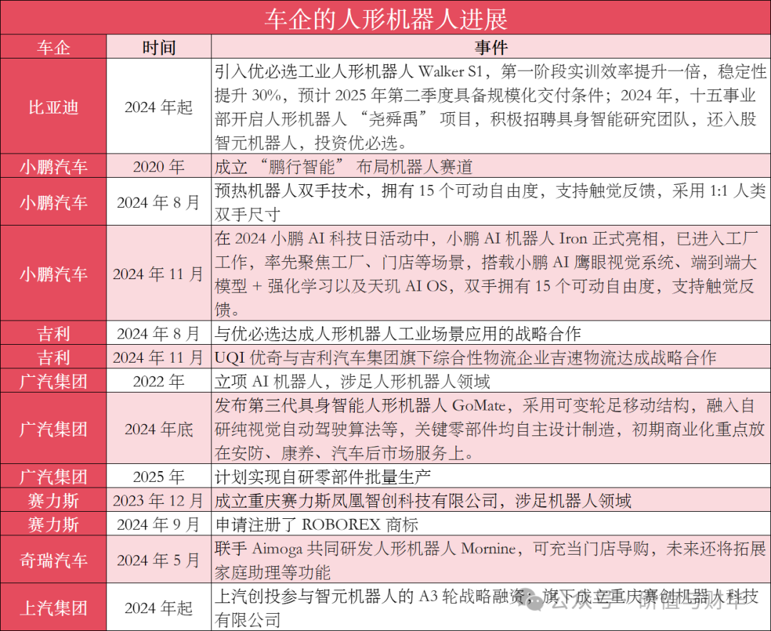 3)整车企业:以比亚迪、小鹏汽车为代表,利用在汽车制造中积累的底盘、动力等技术优势,为人形机器人的研发提供支撑;