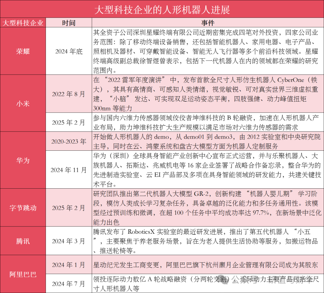 华为、小米、腾讯等大型科技企业于人形机器人领域各有布局且进展显著。