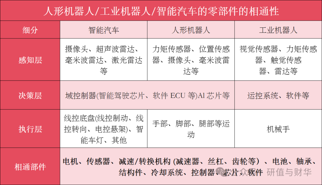 1)人形机器人与工业机器人以及汽车等产业有重合的零部件产业链,有机会比新能源汽车更快实现降本提质。(本文首发公众号:研值与财华)人形机器人的的感知层包括各类型传感器、摄像头、雷达等,决策层主要为芯片,执行层包括手、脚、腿等。和工业机器人和智能汽车类似,人形机器人同样需要电机、传感器、减速机构、电池、轴承、结构件、冷却系统、控制器、芯片、软件等部件。