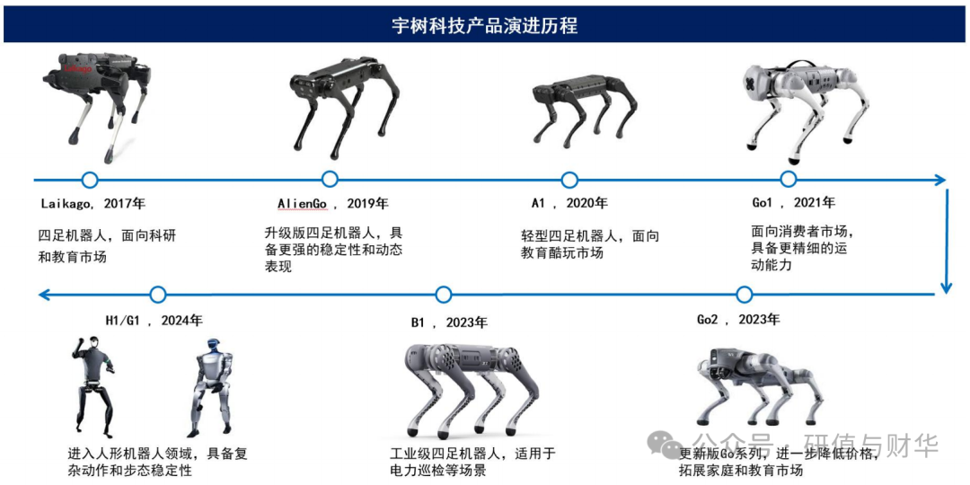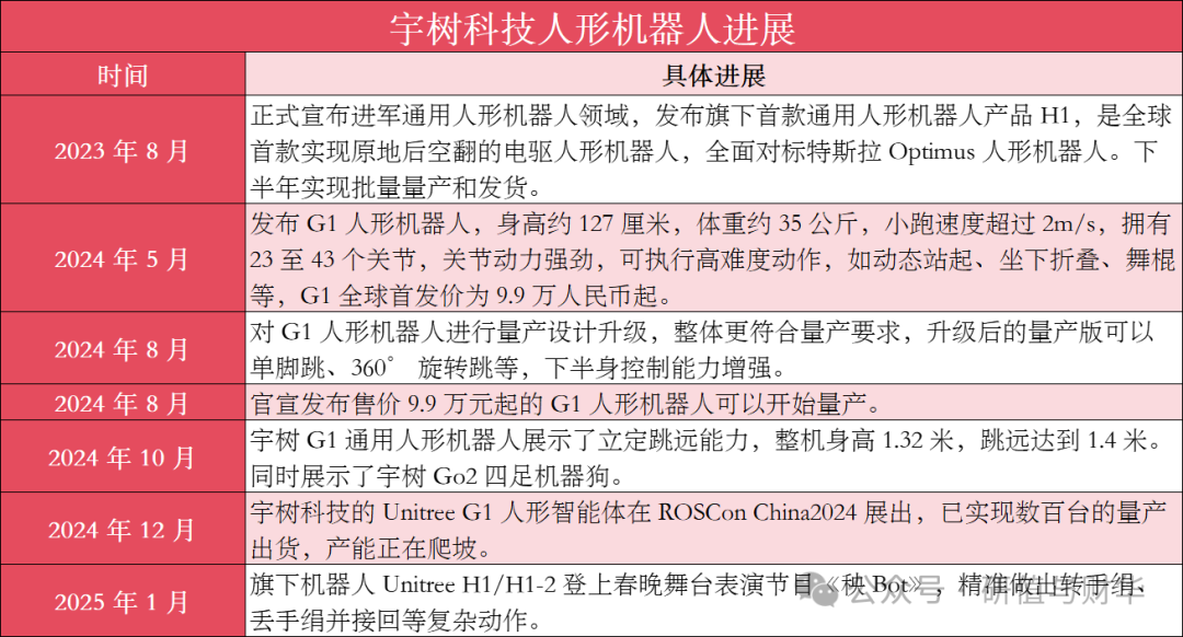 1) 2016年,杭州宇树科技有限公司在浙江省杭州市滨江区成立。公司专注于高性能通用足式/人形机器人及灵巧机械臂的研发、生产与销售。2017年,公司推出重构四足机器人Laika go。此后,Alien go、A1、Go1等多款四足机器人相继问世。2023年,首款通用人形机器人H1发布,标志其在人形机器人领域迈出重要一步。2024年,UnitreeG1人形智能体推出,性价比和卓越性能领先市场。
