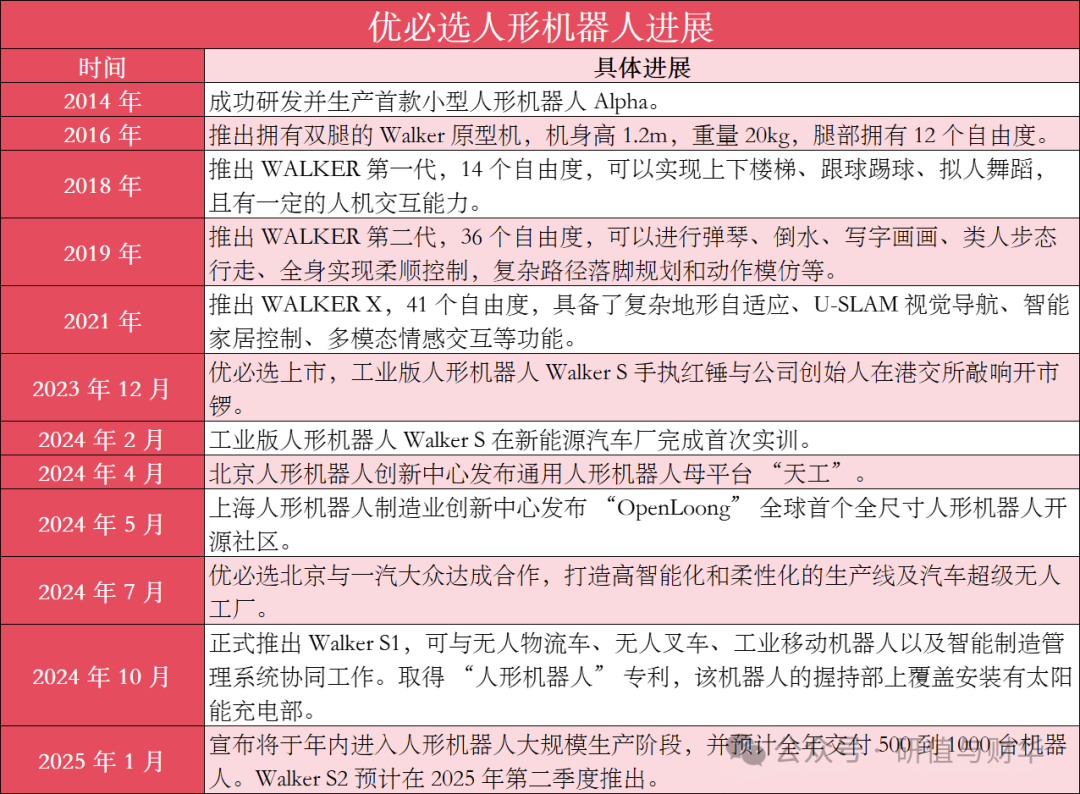 优必选在国内机器人厂商中,商业化进展领先。2014年优必选成功研发并生产首款小型人形机器人Alpha,此后陆续推出多款人形机器人。(本文首发公众号:研值与财华)2024年7月,优必选北京与一汽大众达成合作,打造高智能化和柔性化的生产线及汽车超级无人工厂。2025年1月,宣布将于年内进入人形机器人大规模生产阶段,并预计全年交付500到1000台机器人。Walker S2 预计在 2025 年第二季度推出。