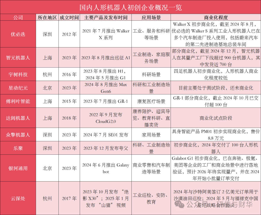 1)初创企业:以宇树科技、智元机器人、优必选为代表,发展势头足,产品迭代速度较快;
