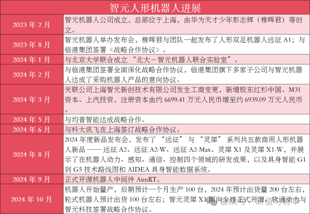 1)智元机器人于2023年2月创立,已经成长为人形机器人领先企业。2023年8月,第一代通用型具身智能机器人原型机远征A1发布,引发行业关注。2024年,智元机器人发展提速,与均普智能、科大讯飞等达成战略合作,拓宽技术应用与合作版图。同年8月,“远征”与“灵犀”两大系列共五款商用人形机器人新品发布,12月宣布开启通用机器人商用量产,发布百万真机数据集AgiBot World。