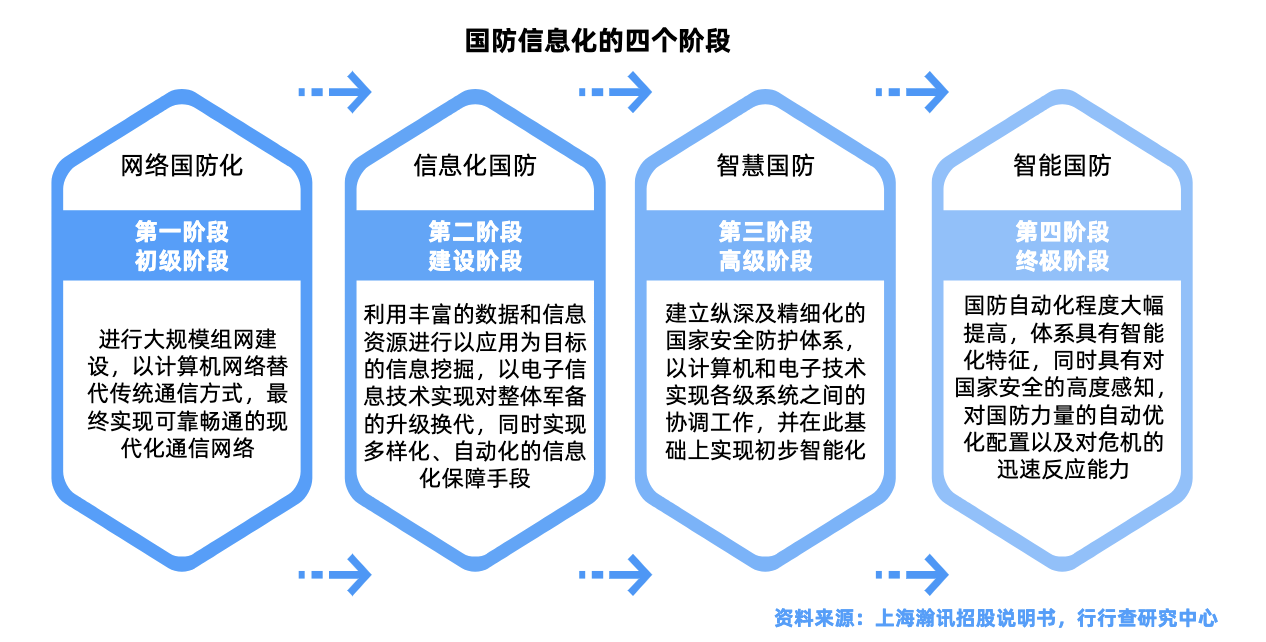 军工信息化的范畴广泛,涵盖了指挥控制系统、战术通信系统、情报侦察系统、导航定位系统等作战信息化产品,以及装备故障诊断系统、设备智能维护系统等装备信息化产品。主要由综合电子信息系统、信息化杀伤武器、信息化作战平台构成。