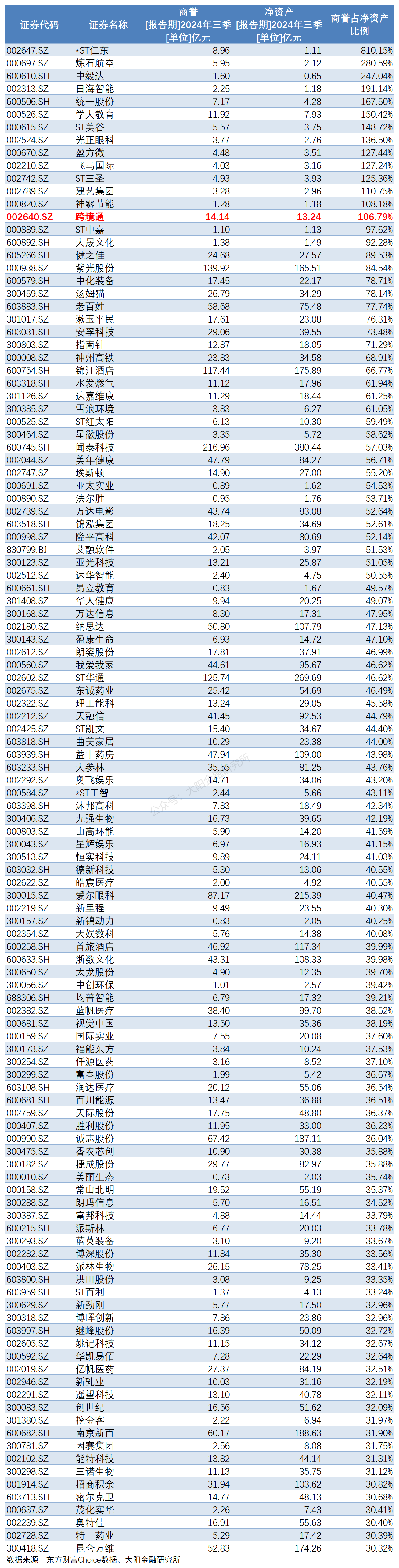 例如前面的跨境通,商誉占净资产比例达106.8%!而跨境通这一比例仅排名15。