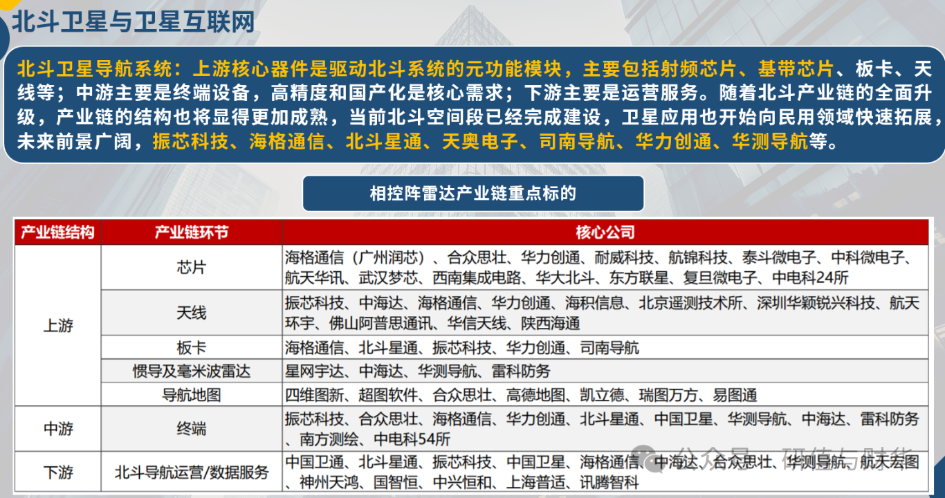 航天科技/科工:聚焦航天器与导弹系统,上游材料依赖中国电科,下游应用延伸至卫星通信。