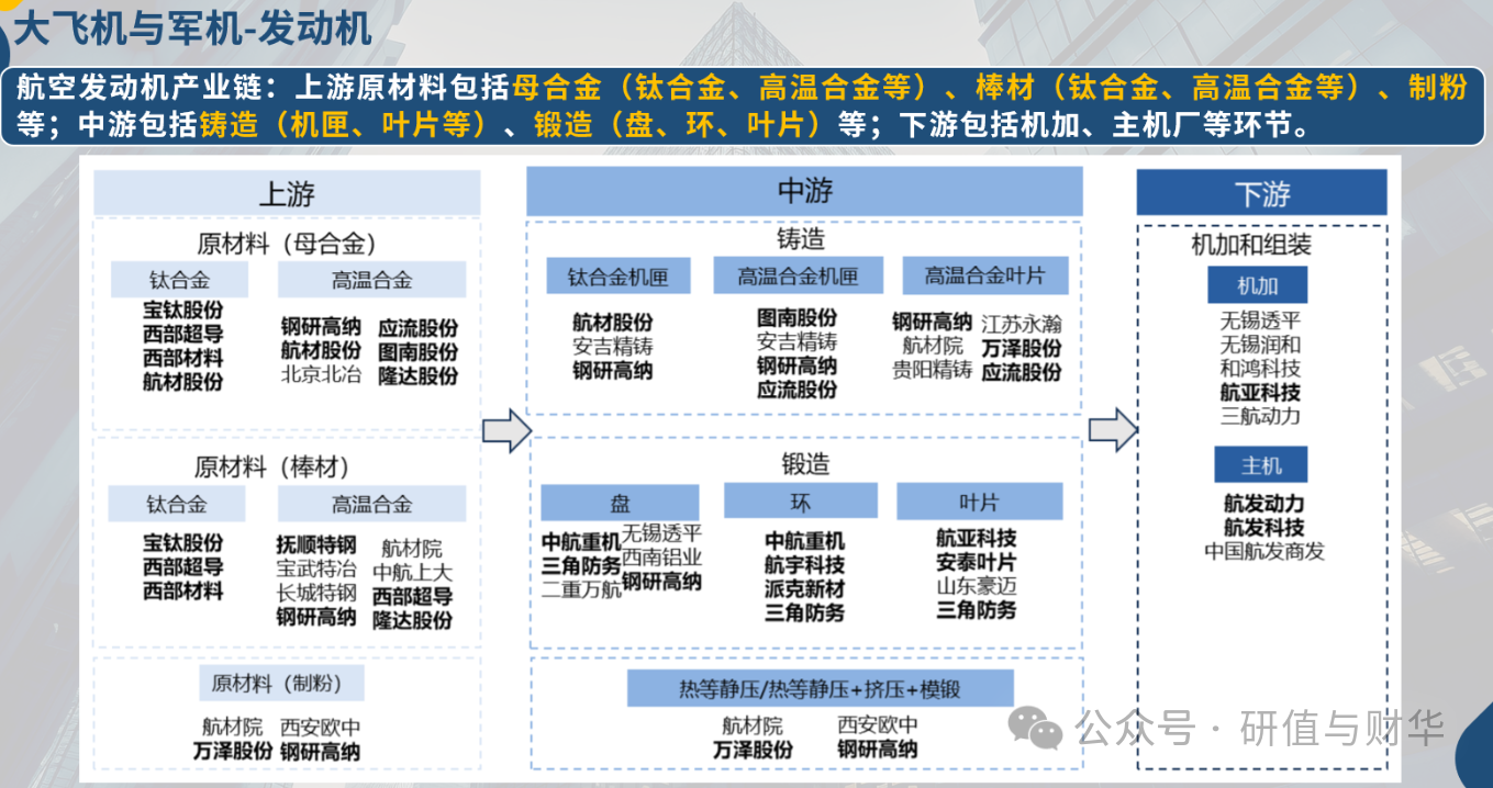 航空领域:中航工业(航电系统、发动机叶片),航发动力(涡扇发动机总成)。