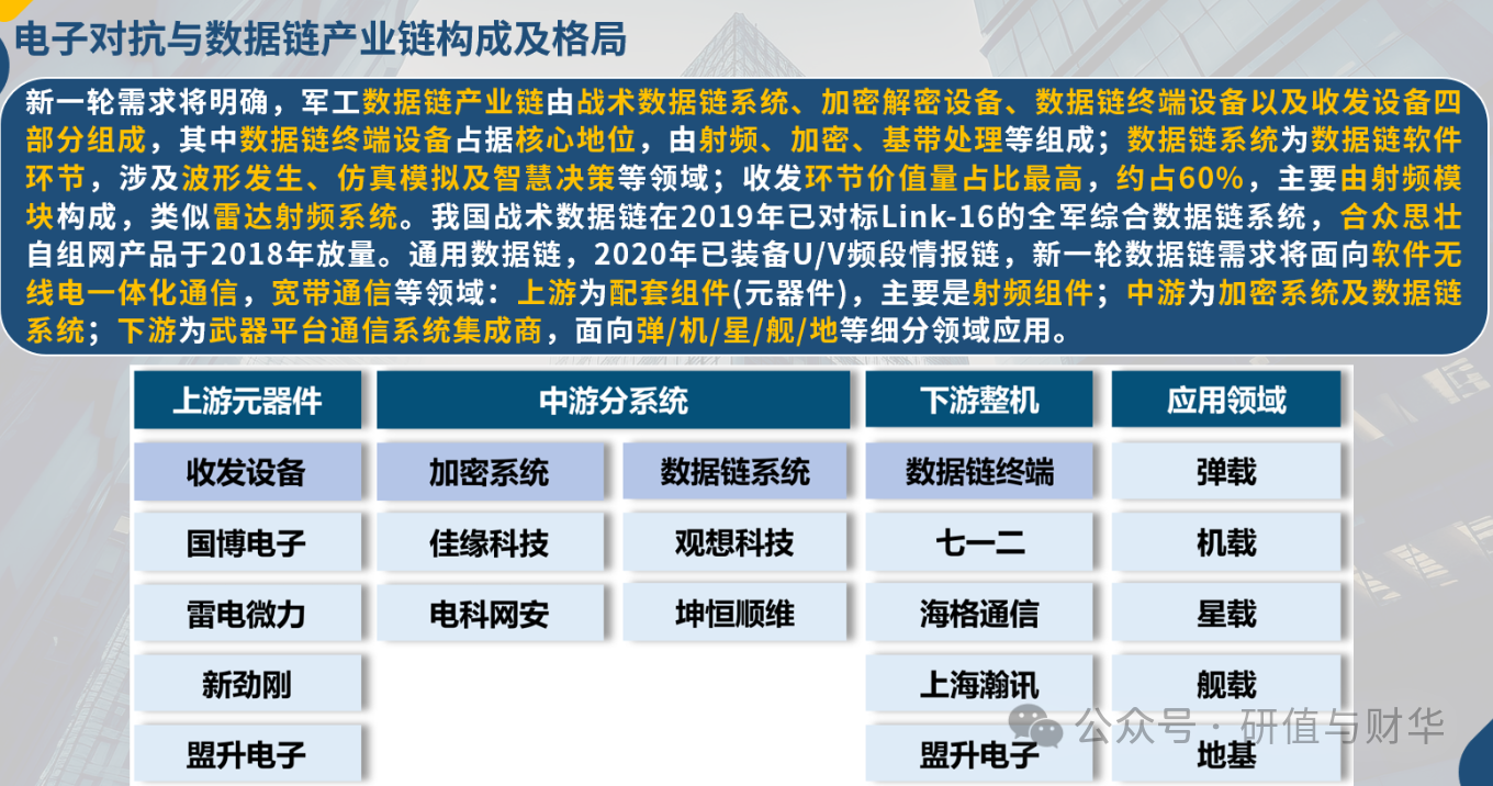 中国电科(雷达、数据链),海康威视(军用光电设备);