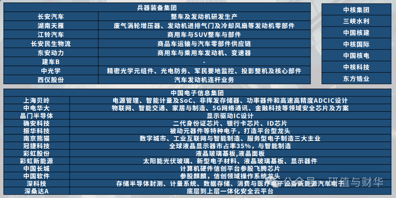 中国兵器工业集团(特种钢材、装甲材料),中国电子(网络安全核心元器件)。