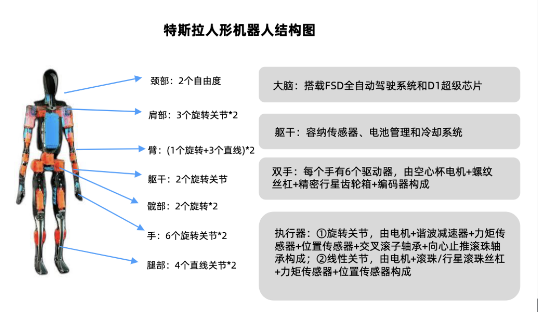 人形机器人具备大脑、小脑、机械臂、灵巧手、旋转关节、线性关节、躯干等关键部件实现对环境的感知交互、运动控制、任务执行。拆解各关节核心零部件结构如下:
