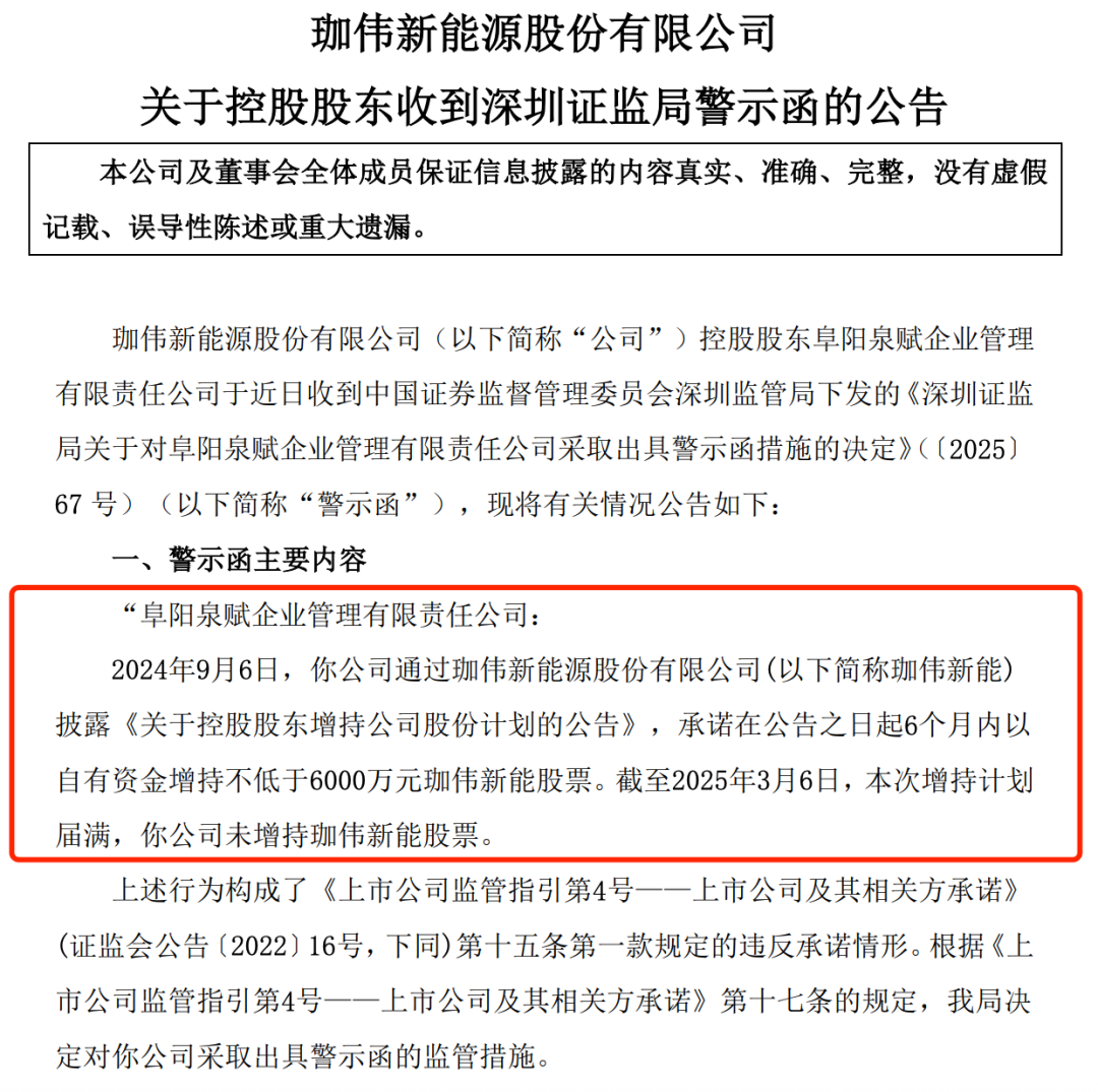 警示函显示,珈伟新能控股股东阜阳泉赋企业管理有限责任公司,在2024年9月6日曾发布《关于控股股东增持公司股份计划的公告》,承诺在6个月内增持不低于6000万元的珈伟新能股票,但到该增持计划届满却一分钱也没增持,违反上市公司监管相关规定。